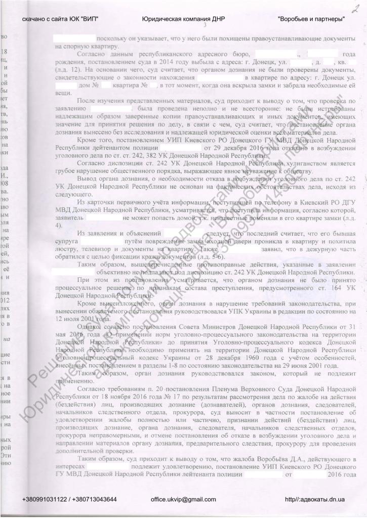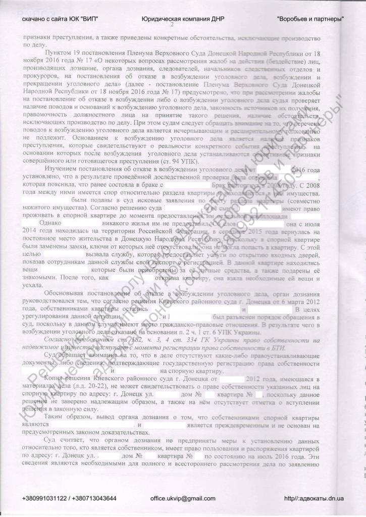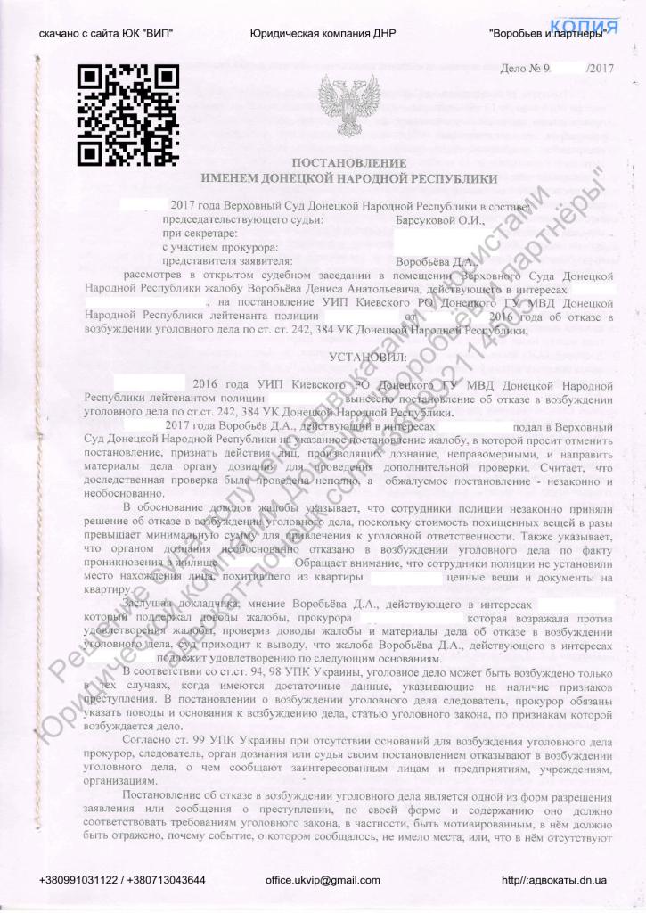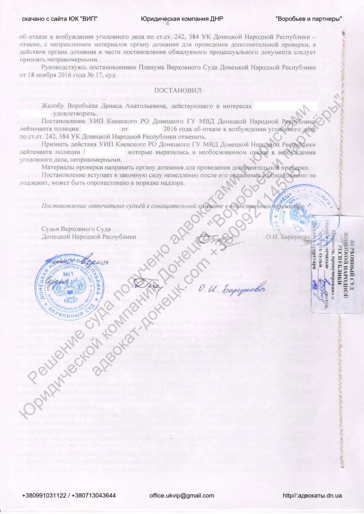 Скачать решение Верховного суда об отмене постановления об отказе в возбуждении уголовного дела в формате PDF на официальном сайте адвокатов Донецка ДНР Юридической компании "Воробьёв и партнёры"