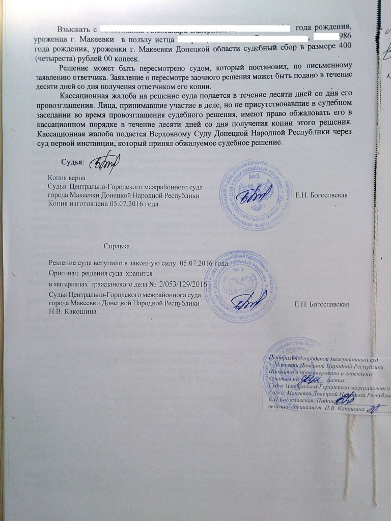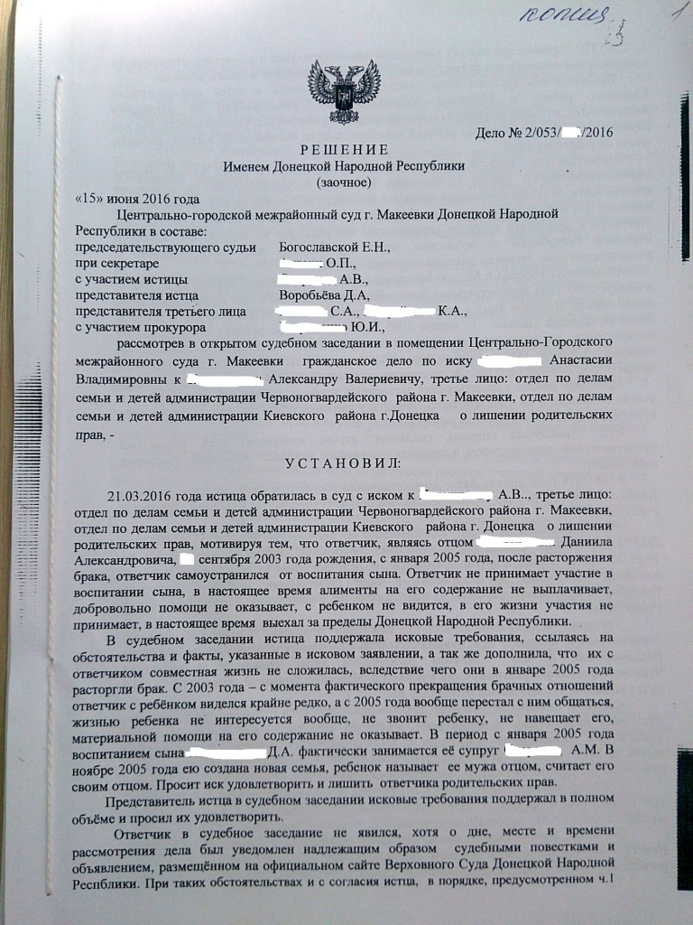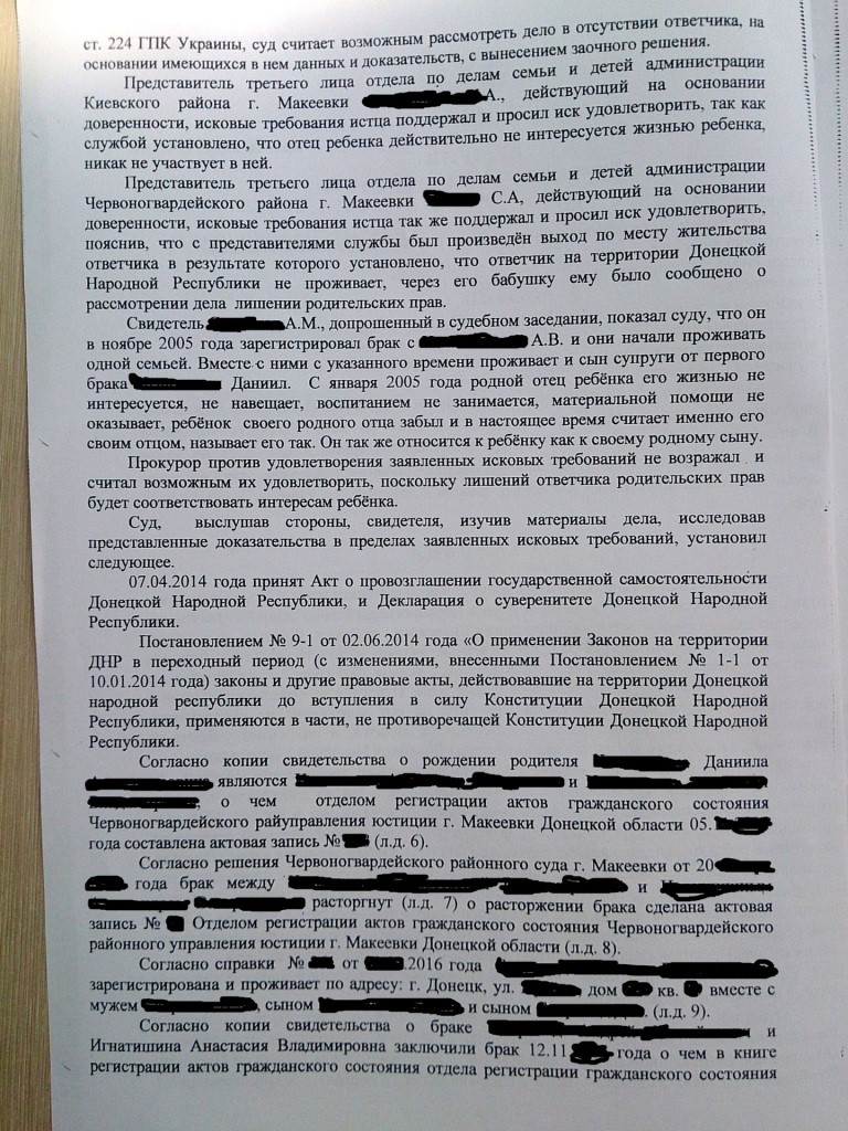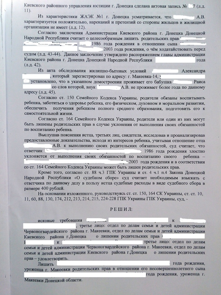 Адвокаты донецкой Юридической компании Воробьёв и партнёры - пример решения суда о лишении родительских прав (Червоногвардейский суд Макеевки 2017 год)Юристы Донецка для своих клиентов добились решения суда Макеевки о лишении родительских прав в отношении отца который не занимался воспитанием ребёнка. Ознакомиться с решением суда можно на страницах сайта адвокатов ДНР ЮК Воробьёв и партнёры - юквип.рус Пример решения суда о лишении родительских прав полученного адвокатами Донецка ДНР в суде Макеевки в 2017 году. Решение вступило в законную силу. Опубликовано на сайте Юридической компании Донецка Воробьёв и партнёры. Получение юридических услуг по лишению родительских прав в Донецке и Макеевке - стоимость участия адвокатов в деле о лишении родительских прав от начала до конца - 30 000 российских рублей. Составление искового заявления - 4000 российских рублей. Консультация - 800 рублей Телефон адвокатов по семейным делам в Донецке +380713043622 Другие решения суда в нашем Телеграм канале. |