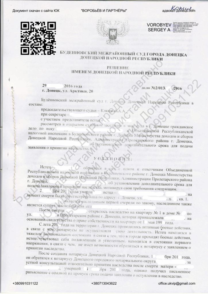 Решение Будённовского межрайонного суда города Донецка ДНР о предоставлении дополнительного срока для принятия наследства и признании уважительной причины пропуска установленного срока для подачи заявления о принятии наследства. Скачать решение в формате pdf официального сайта адвокатов Донецка Юридической компании "Воробьев и партнеры"